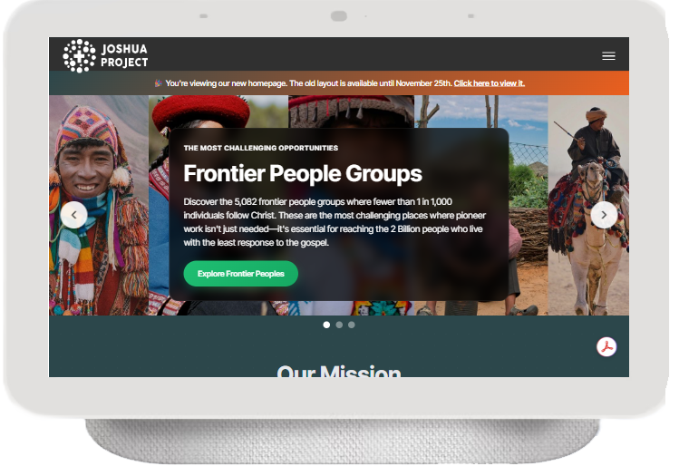 Serving the Great Commission Community, the Joshua Project identifies ethnic and cultural groups with the fewest followers of Christ, often referred to as unreached people groups. They provide statistical profiles, photos, maps, and data, to help coordinate missionary efforts and accelerate the spread of Christianity.